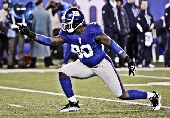 Giants DE sacked Cowboys QB Tony Romo 7 times, forced 3 fumbles, and scored touchdowns on 2 interceptions as the Giants rout the Cowboys 42-10